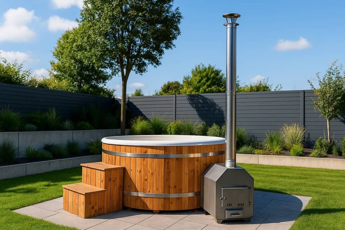 - EXTERNE KACHEL / WITTE KUIP / SPA EN JETS / SPRUCE / 2 LED LIGHTS / RVS BANDEN / FIBER COVER